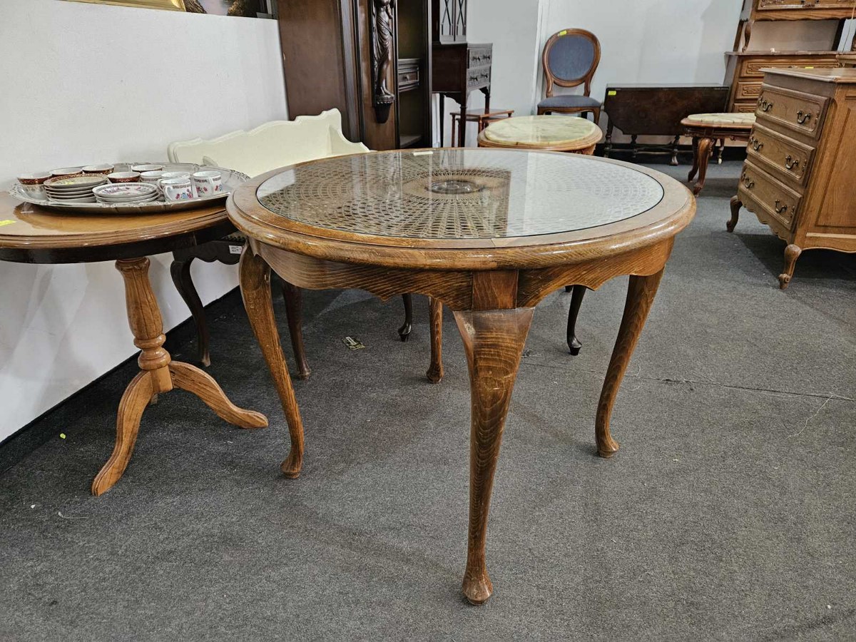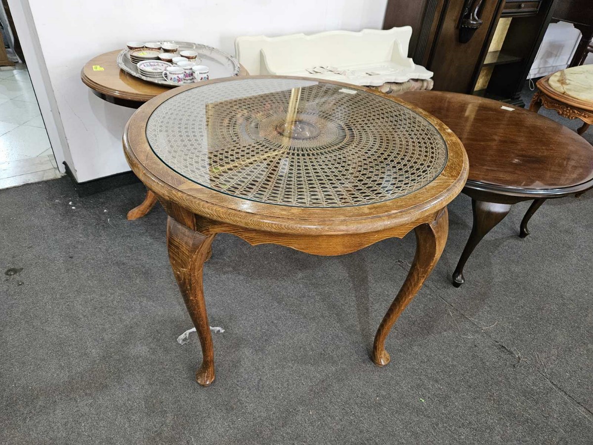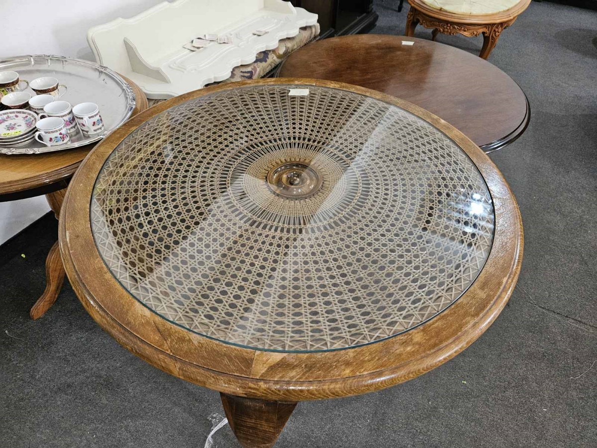 Елегантна маса с масивна дървена конструкция, кръгъл плот със стъкло и ратанова плетка