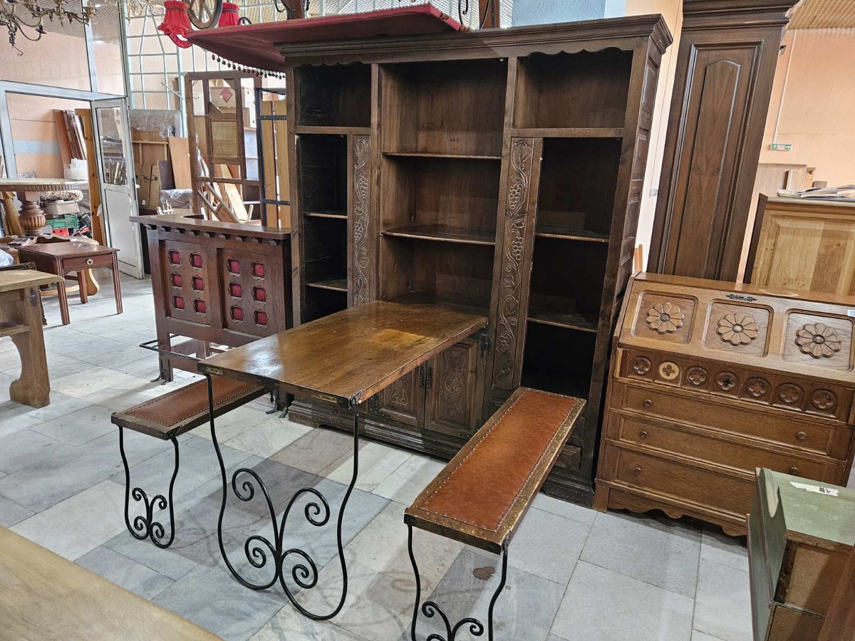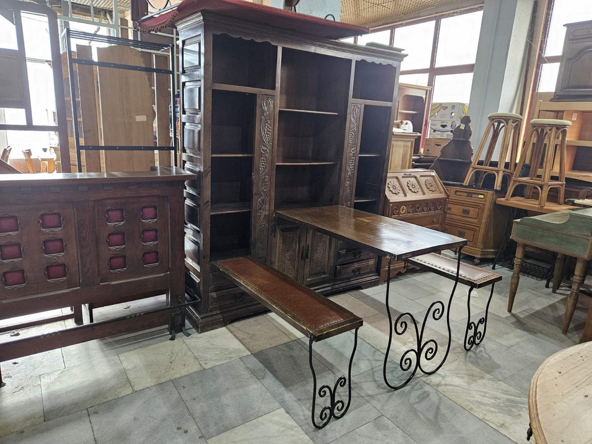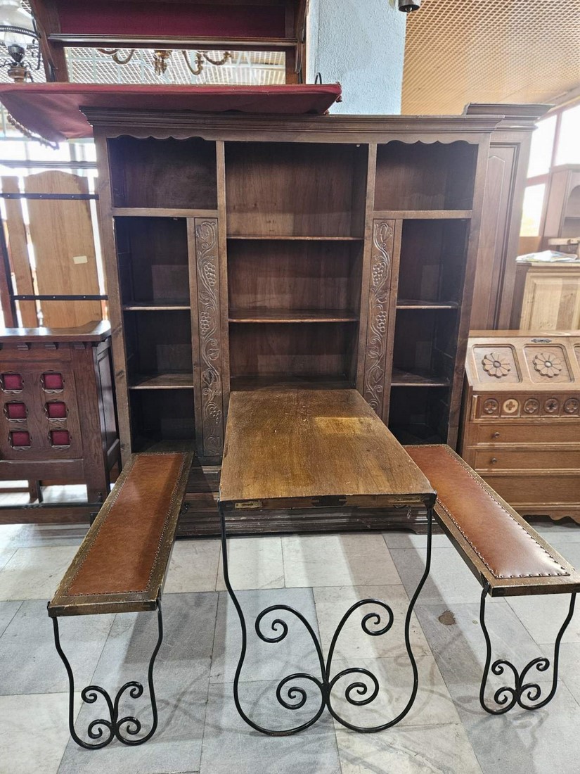 Уникален дървен шкаф с гравирани орнаменти, допълнен от вградени пейки и маса с метална основа.