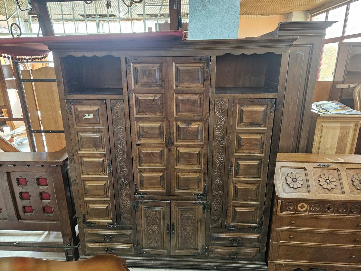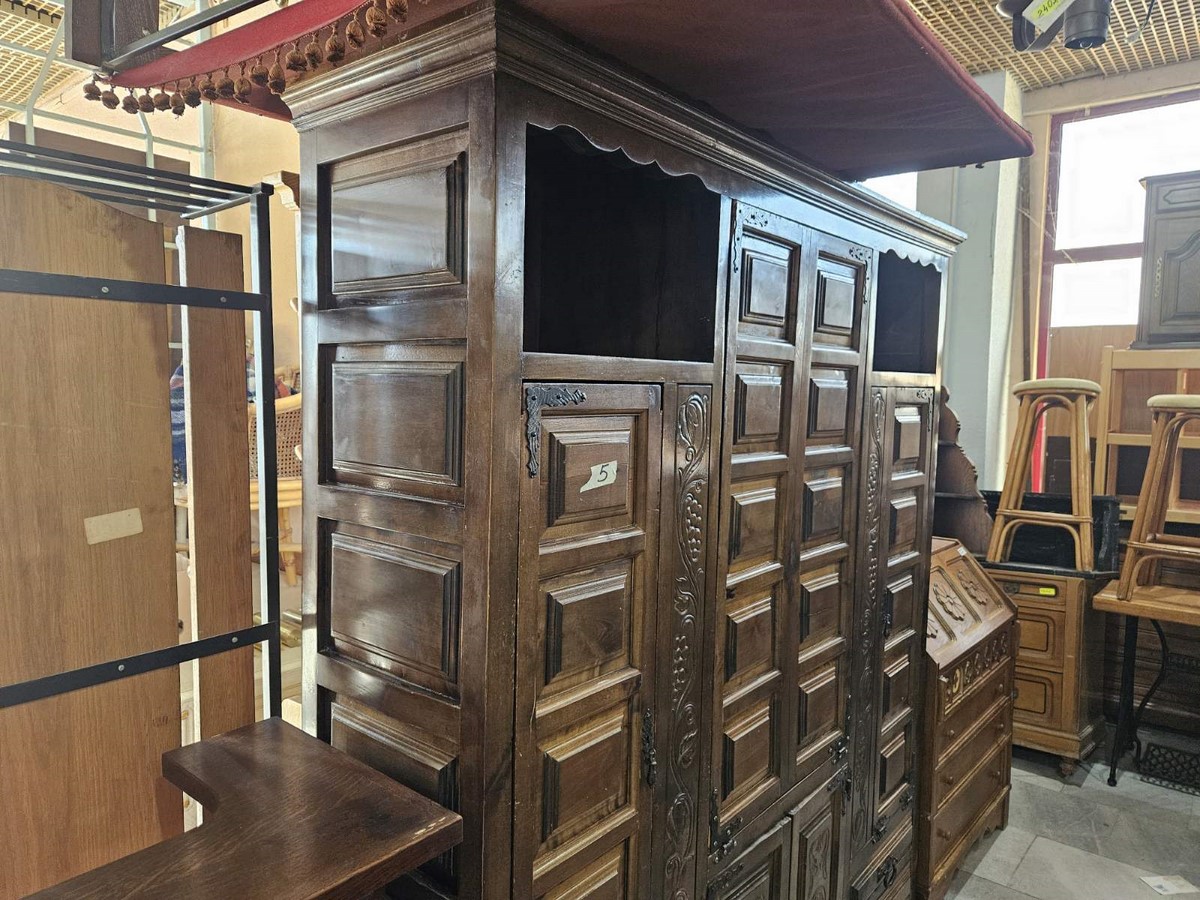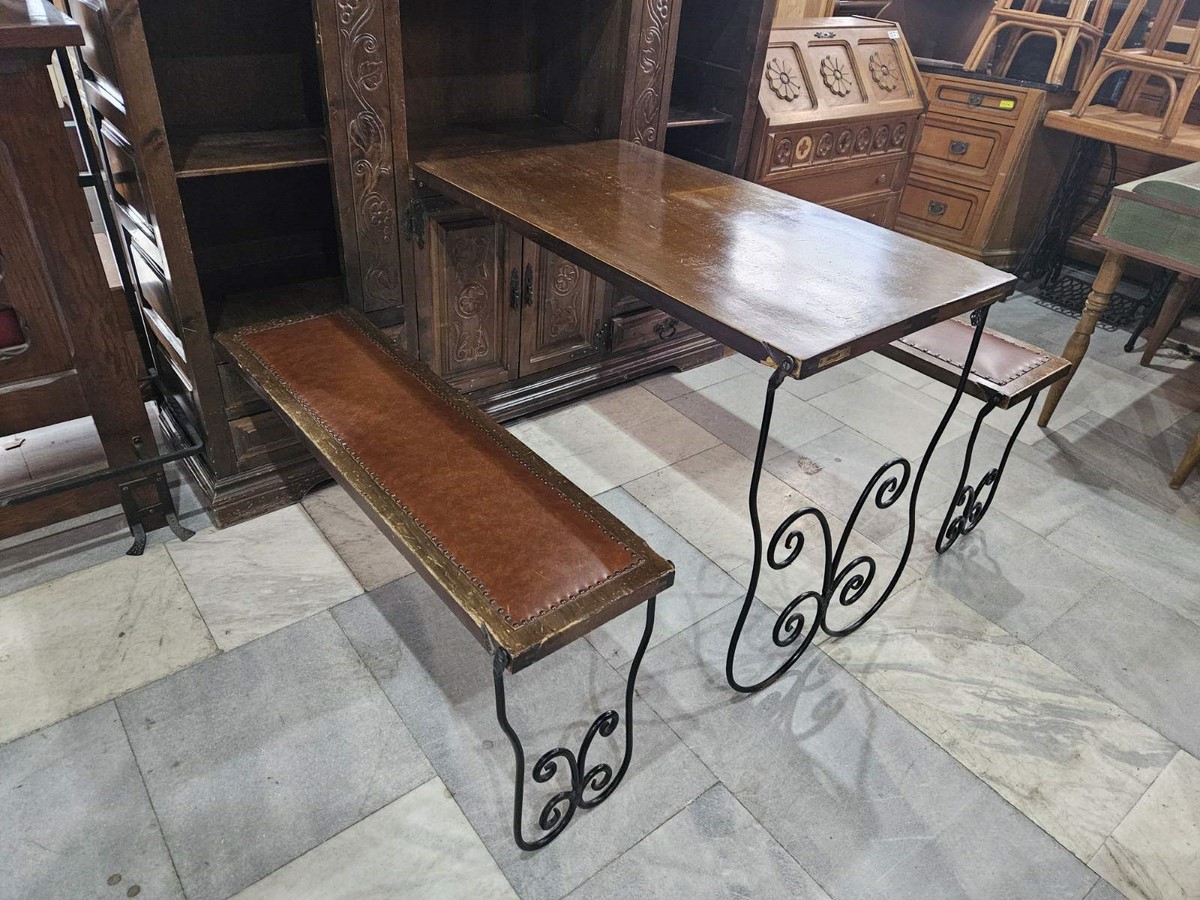 Уникален дървен шкаф с гравирани орнаменти, допълнен от вградени пейки и маса с метална основа.