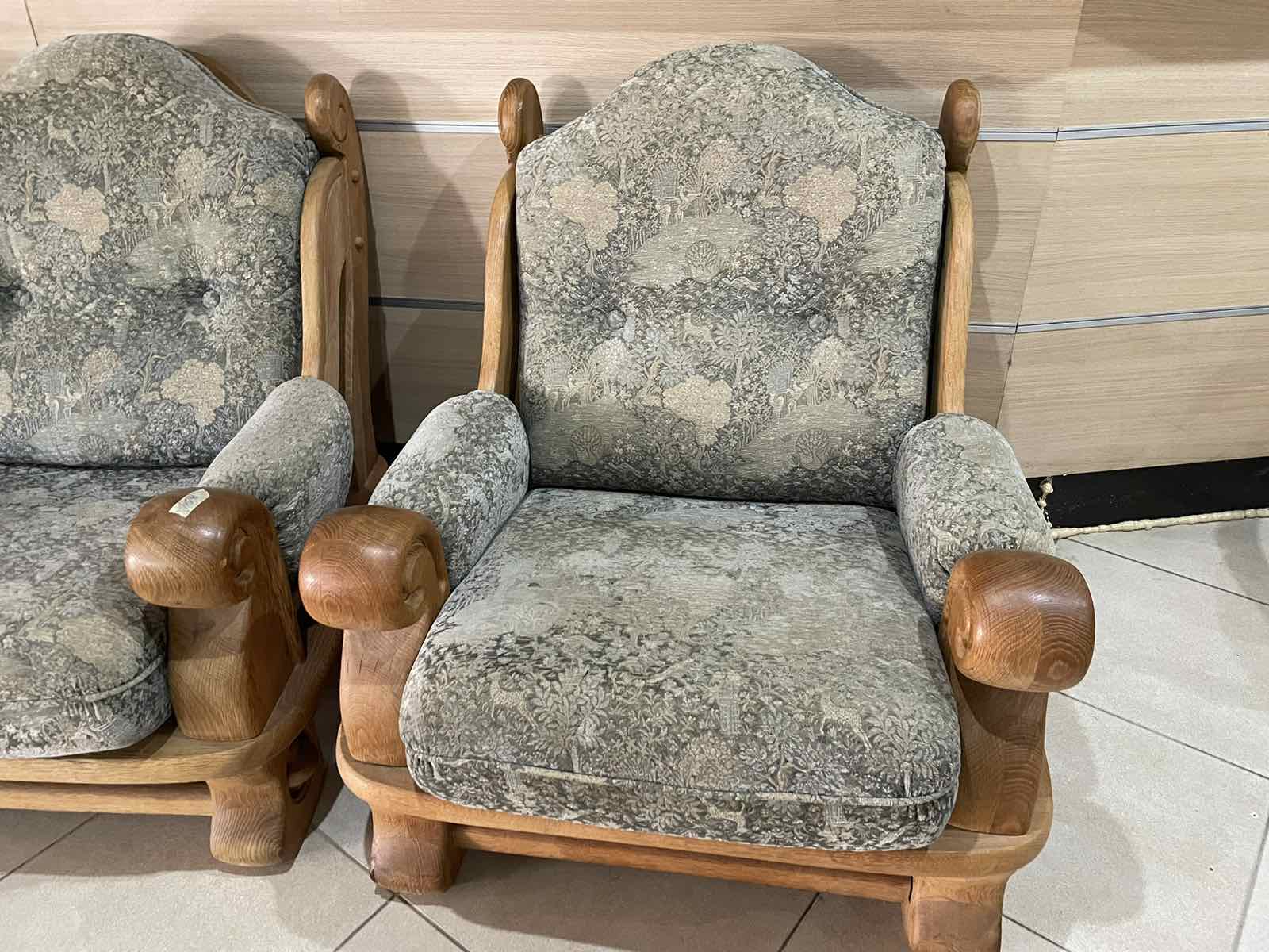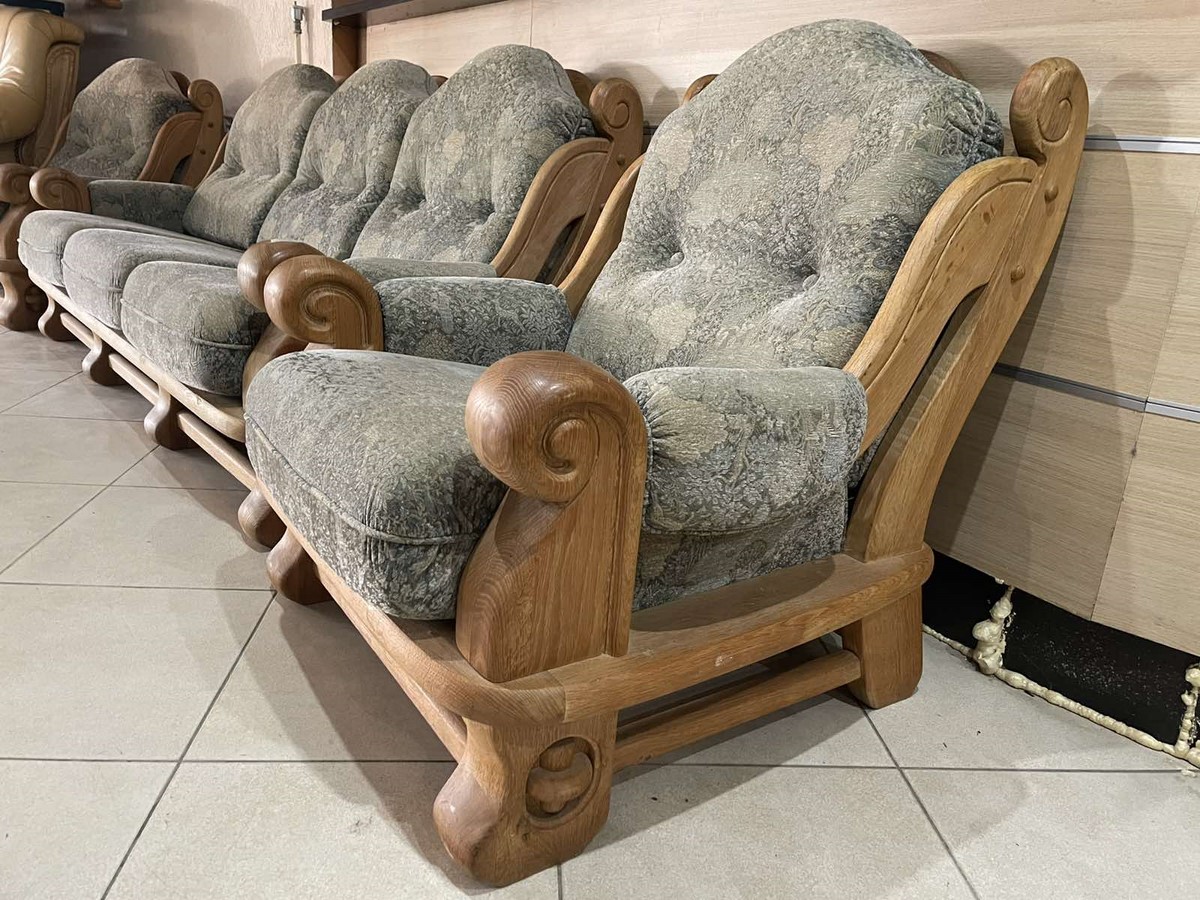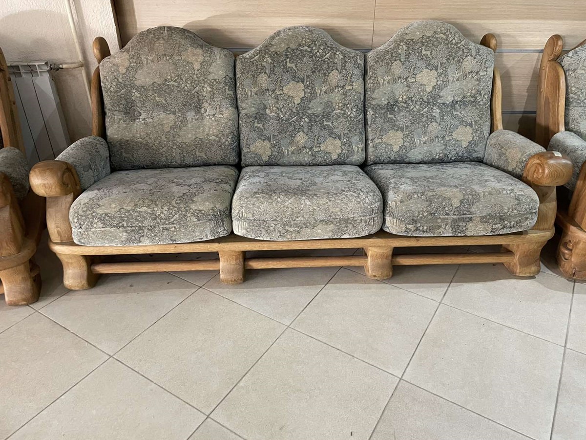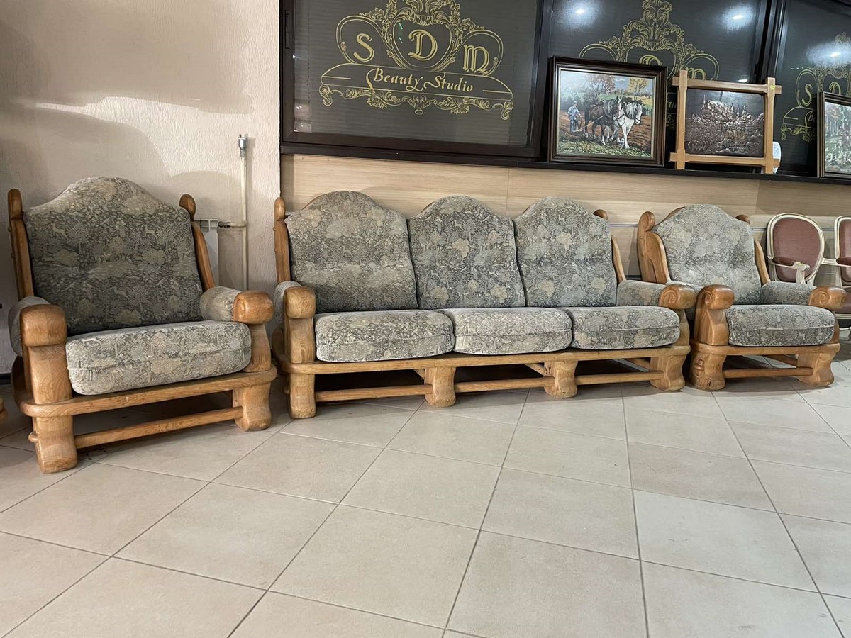 Гарнитура с масивна дървена конструкция и богата текстилна тапицерия.
