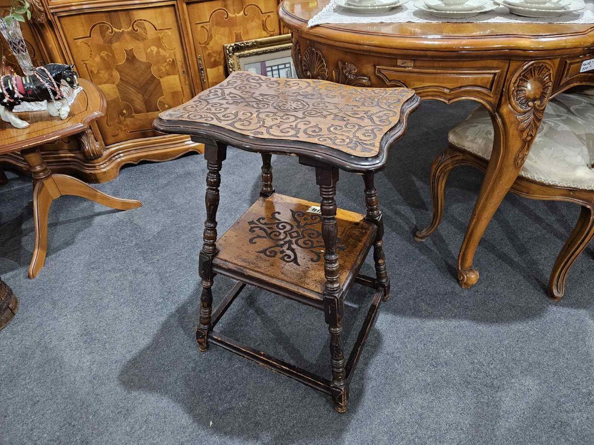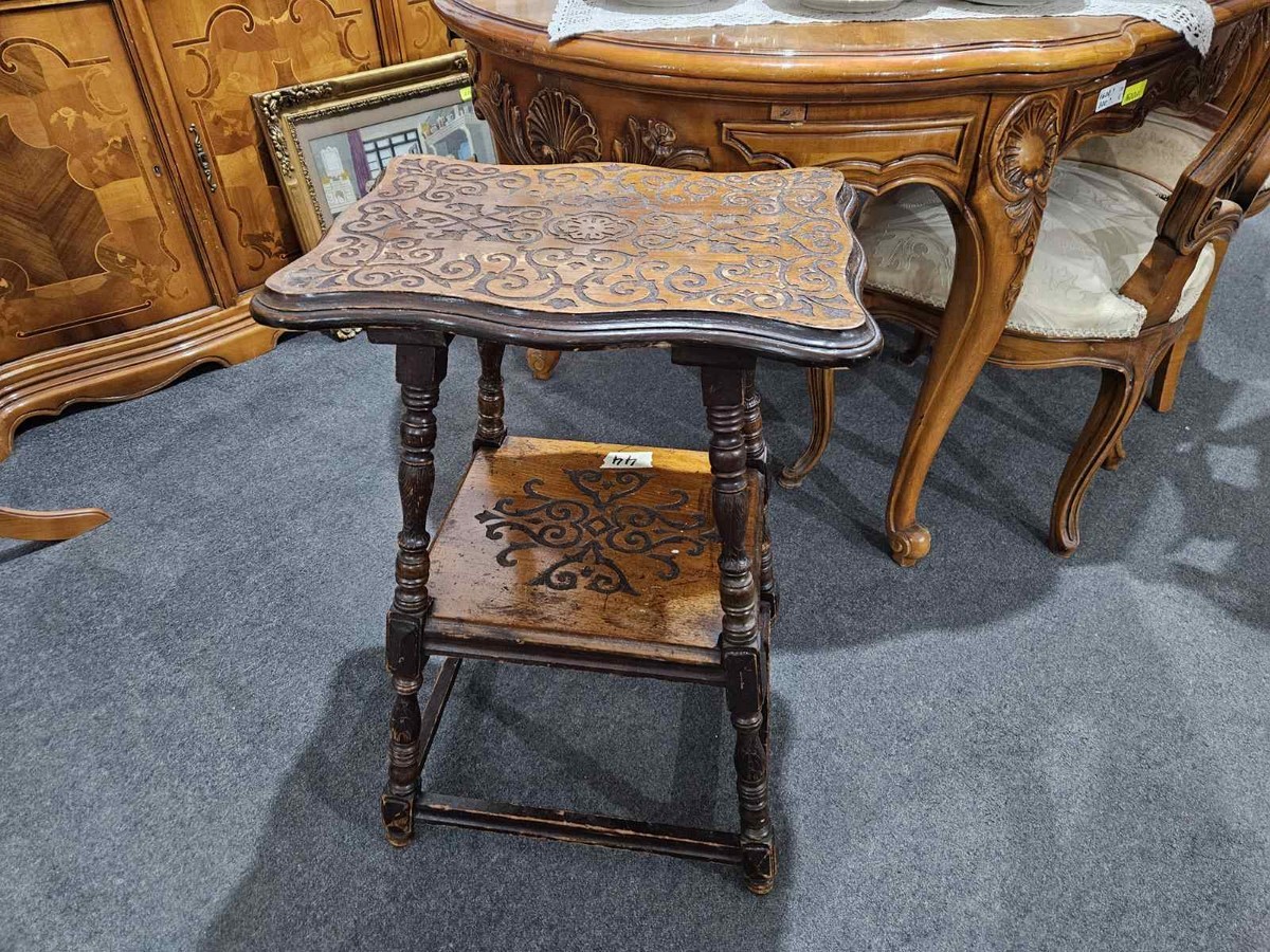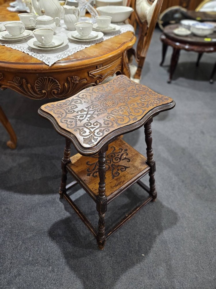 Изящна двуетажна поставка с ръчно резбовани флорални и геометрични мотиви.