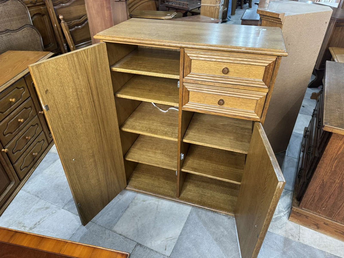 Функционален шкаф с изчистен дизайн и топъл дървесен цвят.